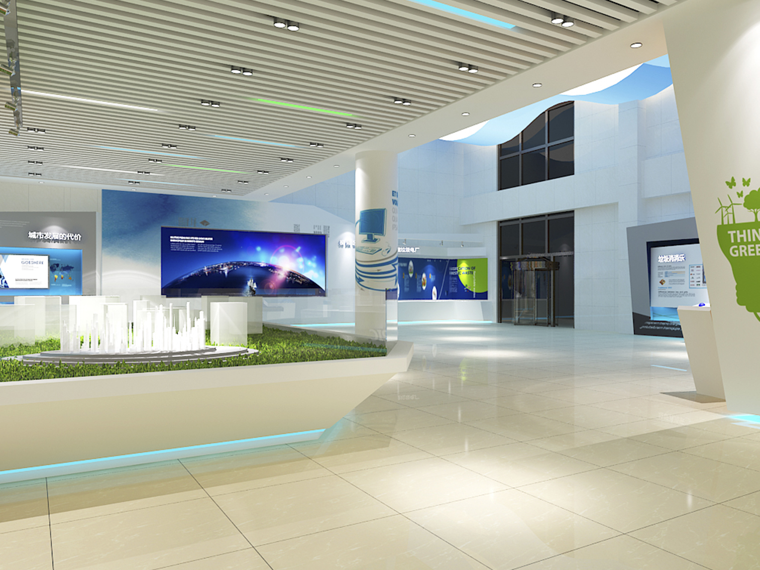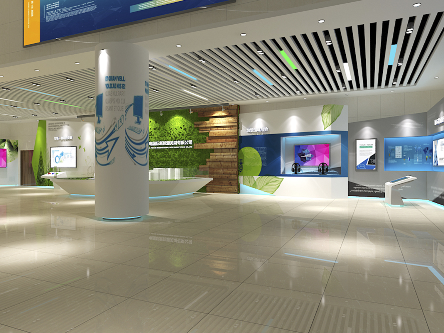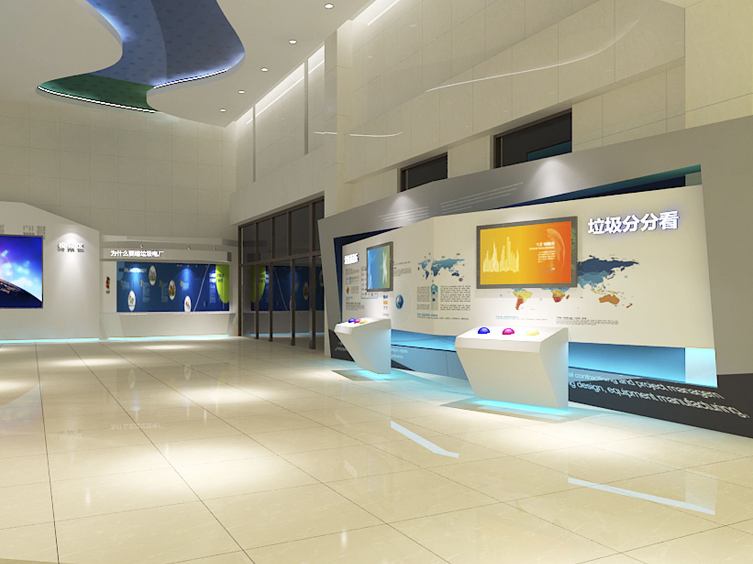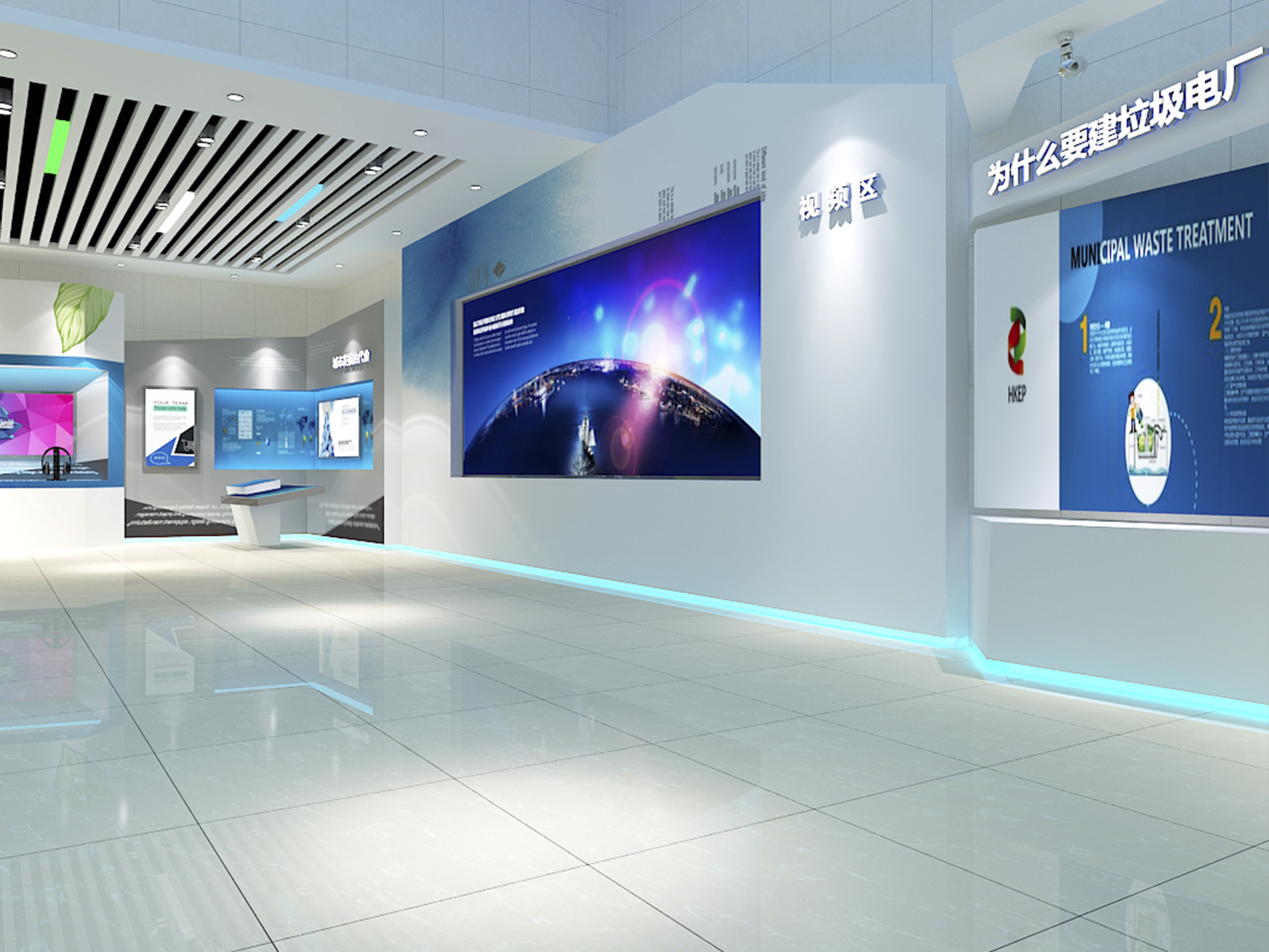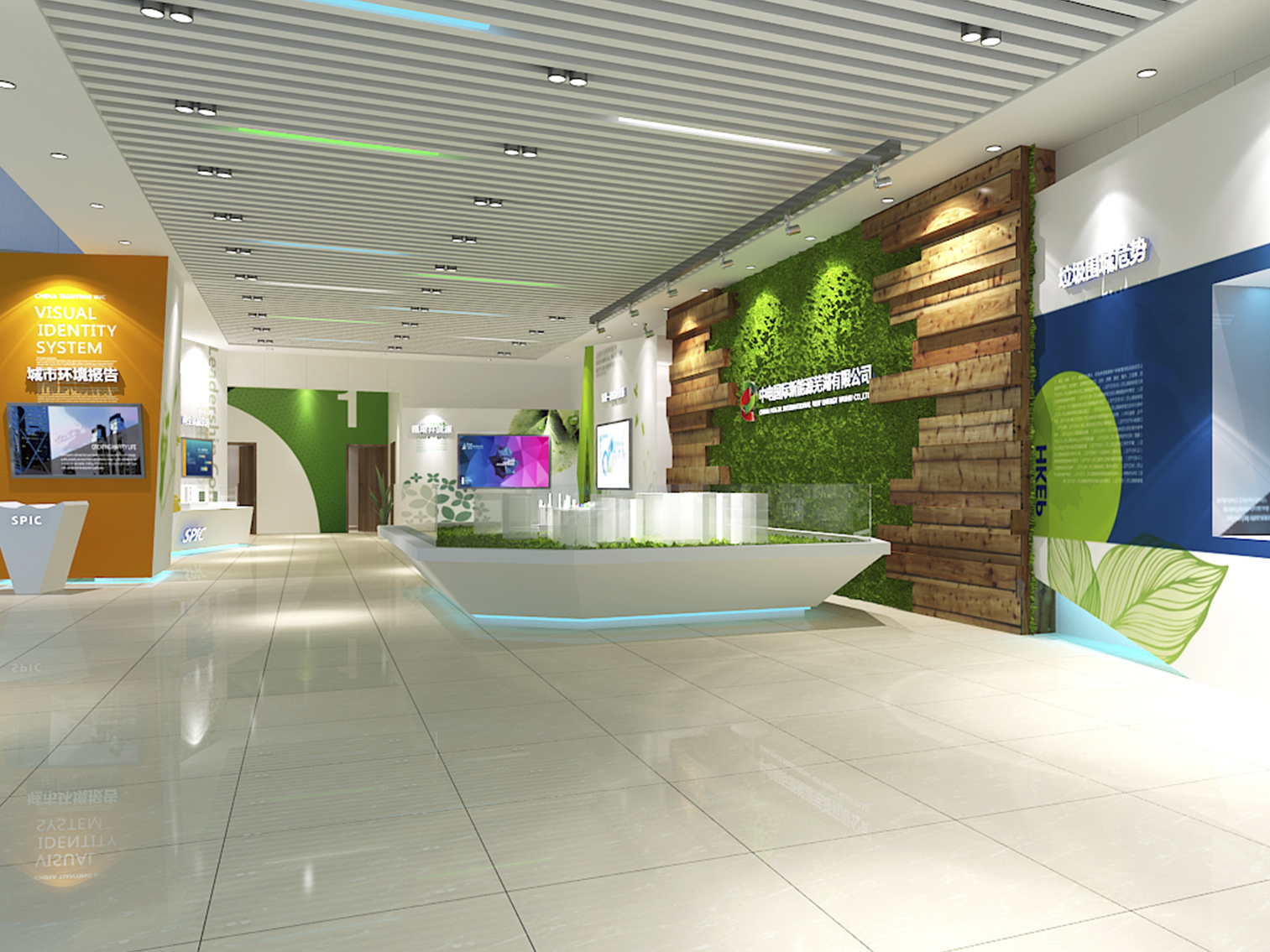受中國電力新能源發(fā)展有限公司委托,本展廳設(shè)計采用藍綠配色作為主色調(diào)突出了綠色環(huán)保這一主題,上百塊展板也做到了風格的完整統(tǒng)一。