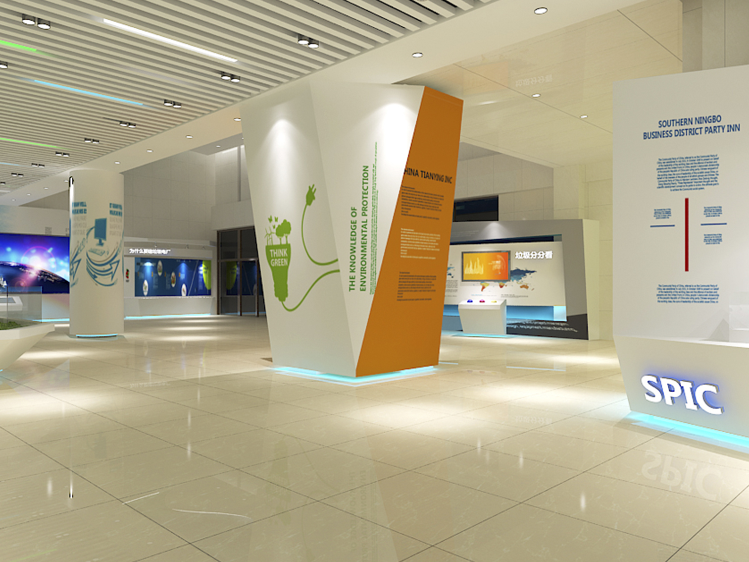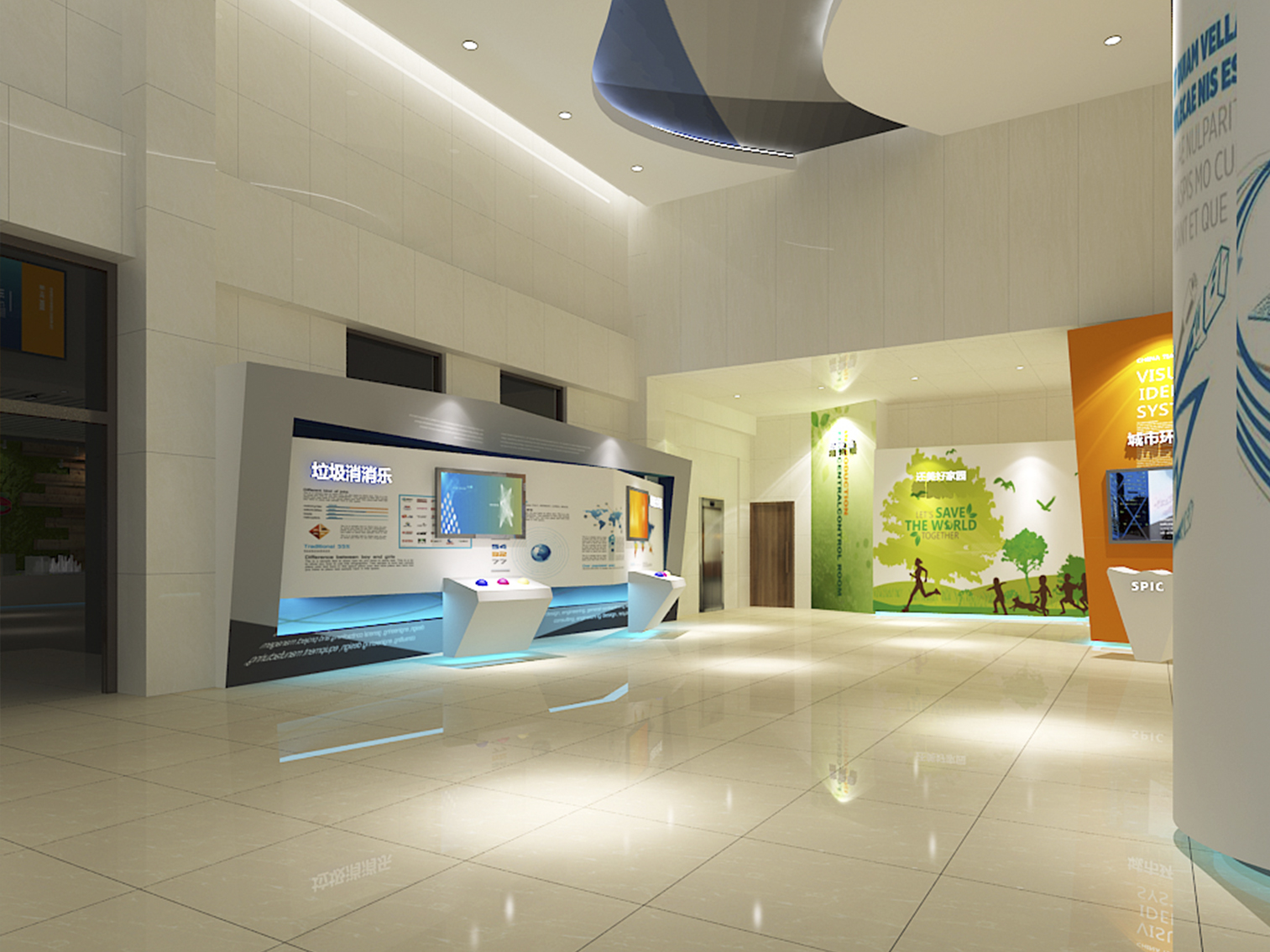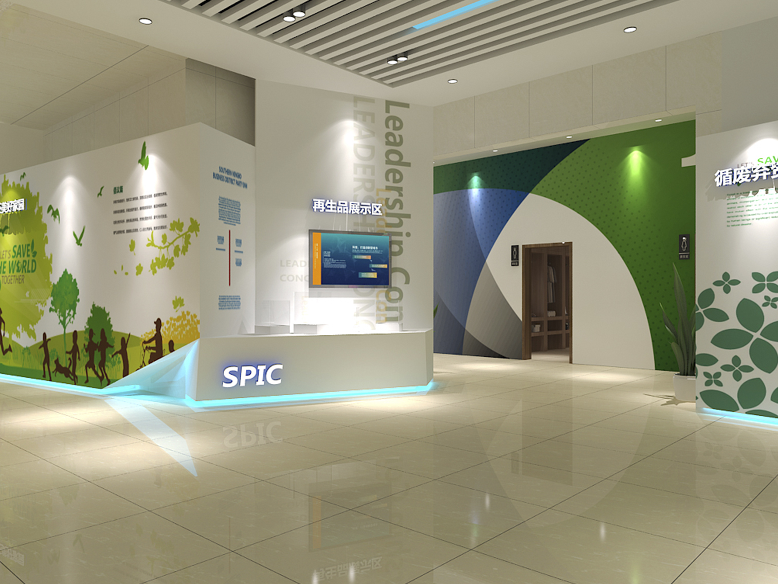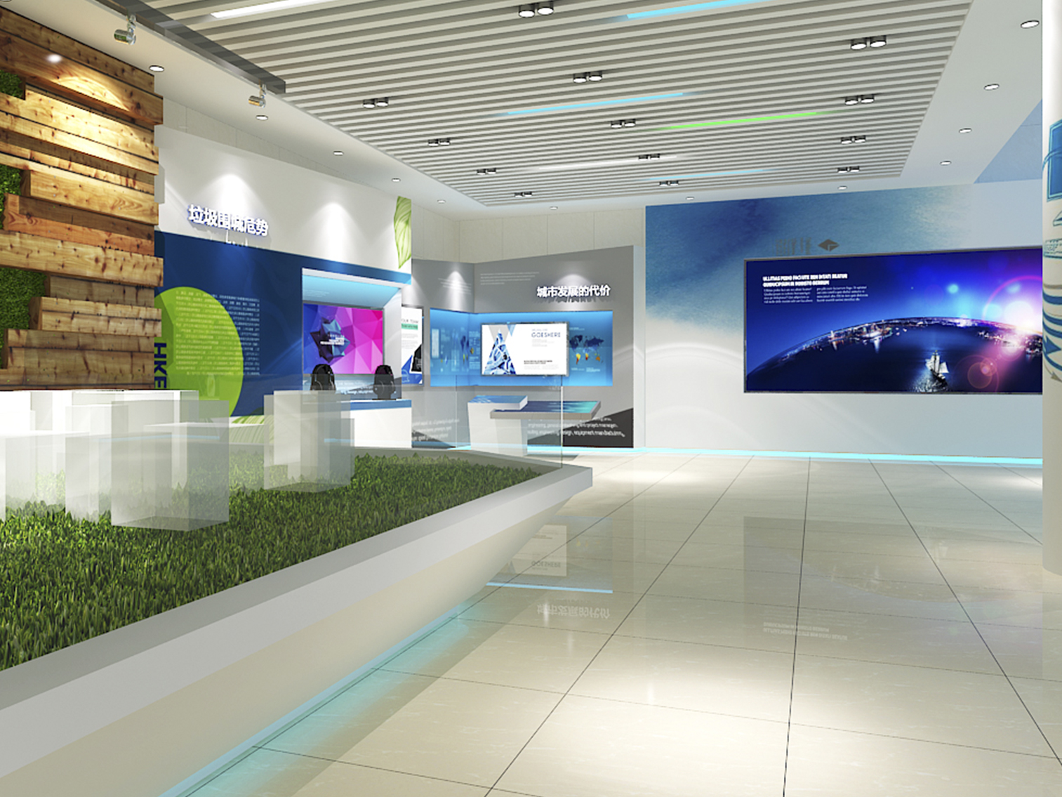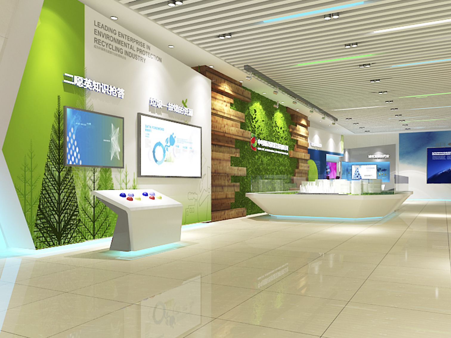 受中國電力新能源發(fā)展有限公司委托,本展廳設(shè)計采用藍綠配色作為主色調(diào)突出了綠色環(huán)保這一主題,上百塊展板也做到了風格的完整統(tǒng)一。